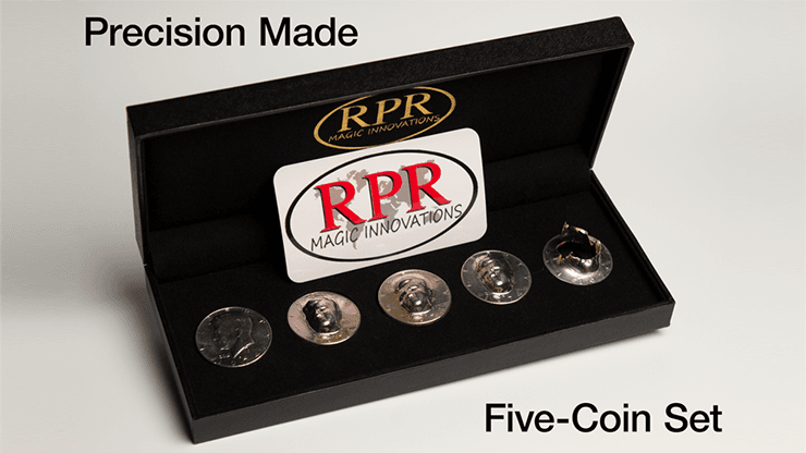 This ultimate coin magic collection includes five coins, all with matching dates: one regular Kennedy half dollar, one Protruding Kennedy with pushed-through back, one Protruding Kennedy with a flush back, one Protruding Folding Kennedy, and one 3-D Radical Karate Kennedy coin.
