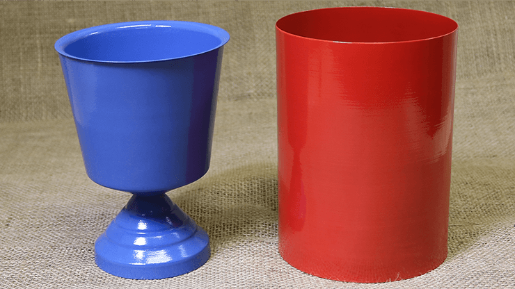 Here is an excellent apparatus to change liquid into a solid object. The performer shows a metal vase. This is shown to be empty. A glass of water/any liquid is poured in the vase. This is now covered with an empty cylinder which the audience clearly has seen right through. Next, making magical passes the performer lifts away the cylinder and then makes a throwing motion with the vase, and out scatters colored confetti, the water has vanished! With some thought you should be able to use the apparatus to change liquid into toffee, garlands etc. and thus making it useful for varied routines.