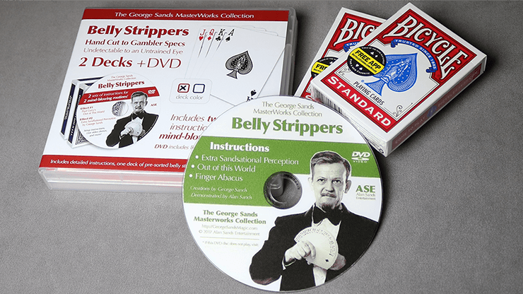 Two different pre-sorted decks of “belly stripper” cards. One deck is used to perform Extra Sandsational Perception, the mentalism routine described above. The second deck is pre-sorted to perform Paul Curry’s Out of this World. You also get printed instructions for how to use the decks and perform the effects, and a DVD. The instructions are also available on Vimeo if the DVD ever stops playing.