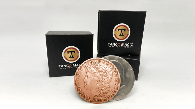 Think bigger, think ONE DOLLAR coins, think performing the same kind of miracles with the biggest coins. Tango Magic, the winner of the Invention Award FISM 2012, introduced a special line combining One dollar Eisenhower and a beautiful COPPER MORGAN COINS. Now you will have Copper and Silver, Scotch and Soda and Hopping half in Eisenhower one dollar size.