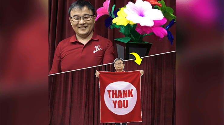 Instantly the magician transforms the flowers into a large, full-sized banner that says, “thank you”.