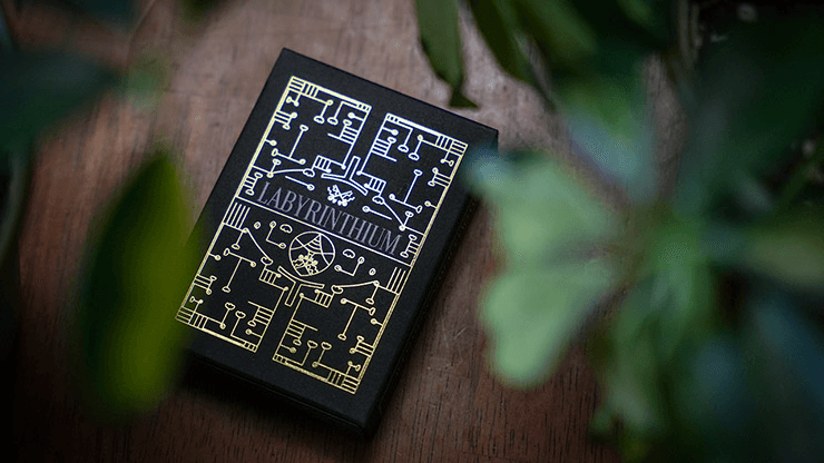 The faces use gold & red foils and feature stylish courts and customized number cards. The custom jokers can be used as wild cards in all of your favorite games, while two bonus gaff cards can be used for magic tricks.The Labyrinthium decks also feature black edge printing to give the decks a pure black feel. This is not the same as black gilding. Rather than black foil edges, the edges have been printed with black ink. This gives the edges a matte finish that doesn’t interfere with the grip or handling of the cards.