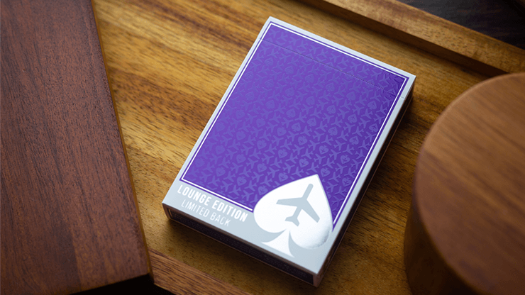 With the Limited Back version of the Lounge Edition in Passenger Purple, the deck provides an upgraded feel over the Standard Back version. The cards showcase re-colored standard faces and have an untraditional offset classic and casino inspired back design that pays homage to a major US-based airline’s livery of recent years with the purple colorway. On the Limited Back version, the back design is upgraded with both silver foil and clear UV spot varnish. The cards are traditionally cut to provide the ability to weave or faro shuffle facedown. The tuck box exhibits premium features with a durable synthetic stock material, clear UV spot varnish, and more silver foil than the Standard Back version.