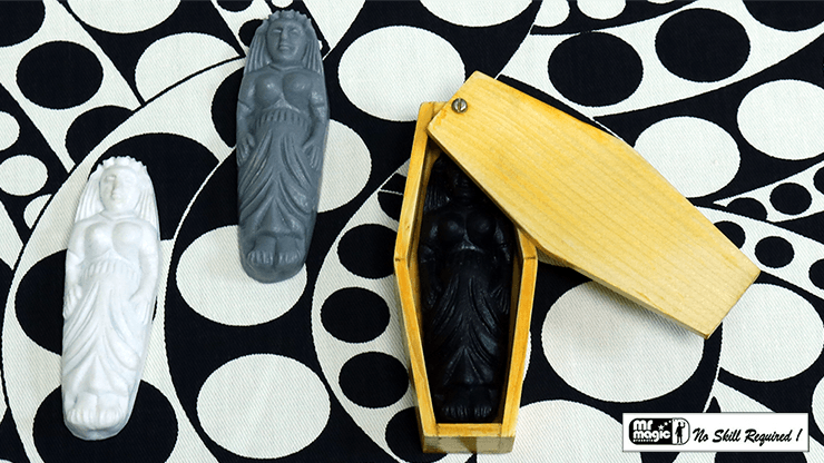 Remember — the mummies are handed over to a spectator, along with a plastic coffin, and the spectator is invited to place the mummy he fancies into the coffin. The other two mummies are concealed, but each time, the magician can immediately reveal the correct color of the mummy without ever touching it. You’ll love performing this and amazing your audience!