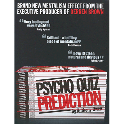 A random spectator is asked to answer out loud three questions from a psychological personality quiz on the back page of a genuine issue of Cosmopolitan magazine (USA edition. Please note magazine is not included. Purchasers are given details of how to easily obtain copies outside of the USA). Amazingly you have correctly predicted in advance with a three stage prediction exactly which answers they will give. Three big, amazed reactions from the audience are guaranteed from just a magazine. No one ahead (all three predictions are written before anything is said by the spectator).