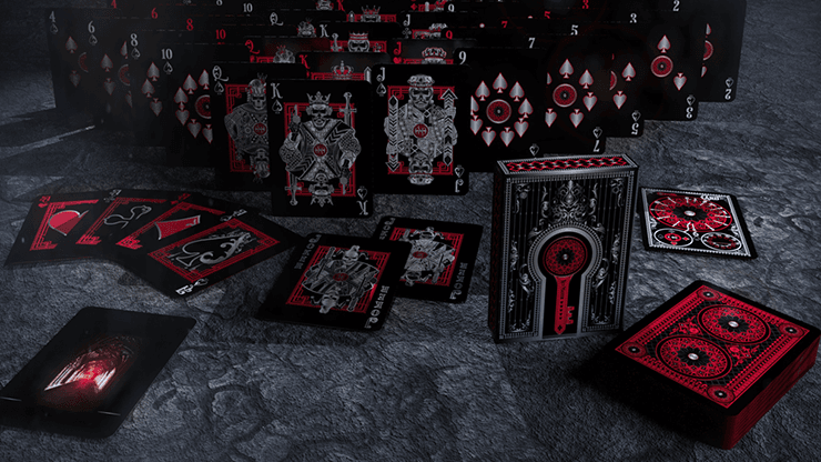 Ten years in the making this LIMITED EDITION one of a kind project will simply BLOW YOUR MIND! Secrets of the Keymasters is a gorgeous deck full of incredible detail and ingenuity! 100% custom courts, pips, indices and an amazing back design. This deck is full of secrets and functionality! One of the biggest secrets contained within this deck is the special marking system allowing you to look at the back and instantly know what card it is. The marking system is straight forward and simple, it’s a mirrored single point system meaning that with one mark you can know both the number and suit.