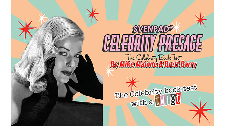 WELCOME TO SVENPAD® CELEBRITY PRESAGE. WE HONESTLY BELIEVE THIS IS THE GROOVIEST BOOK TEST TO BE RELEASED TO THE MAGIC FRATERNITY IN A DECADE! THIS IS NOT YOUR GRANDDAD’S BOOK TEST. IN FACT, THIS TOTALLY REALISTIC PAPERBACK OF CELEBRITY QUOTES & STORIES UTILIZES A POWERFUL SECRET METHOD, THE PERFECT PAGE NUMBERING SYSTEM, A DEVILISH NEW REVISED FORCING SYSTEM. COMBINED WITH OUR INSANELY PRECISION PAPER MANUFACTURING (PAGES CUT TO 1/32″). YOU WILL HOLD IN YOUR HANDS A BOOK TEST LIKE NO OTHER.