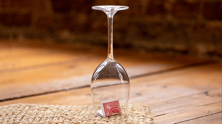 A folded card, that has been trapped under an inverted clear wine glass in full view, is shown to be a card named by a spectator.