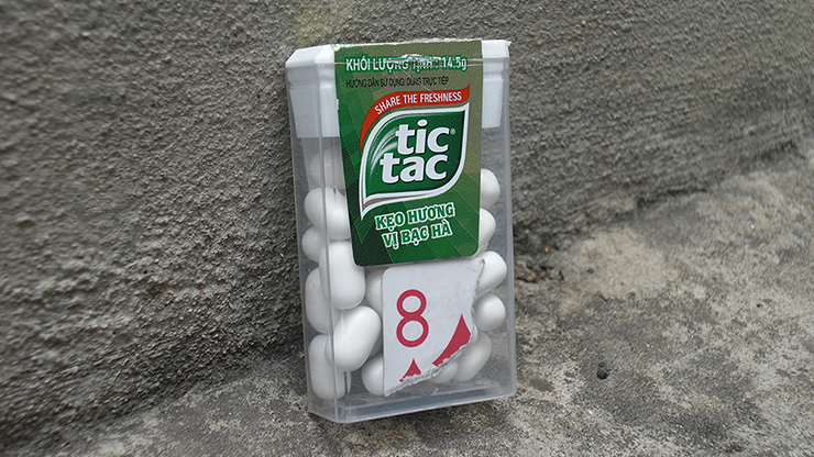 A corner of a playing card is torn off. Magically, it visually melts through the side of a Tic Tac box! The rest of the playing card is held up to the ripped corner that’s now inside of the box… it is a perfect match!
