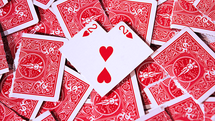 Magician shows a two of hearts to the audience, rips it from the middle, then staggers the two pieces together.